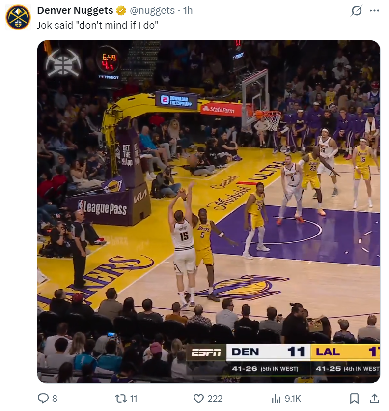 上一场对阵马刺约基奇是31+20+12的三双,此役拿到三双后已经是连续四场比赛三双,末节约基奇休息了3分多钟登场,虽然约老师上来没有得分但送了两个三分助攻直接拉开分差,东契奇连拿6分帮助湖人抹平分差,两队各送失误,决胜时刻里夫斯两罚一中自己拼下前场篮板抛投绝平。